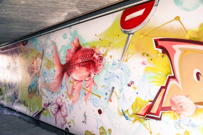 Die über 40 Meter lange Fassade der bekannten Markstätte Unterführung in Konstanz (Altstadt) wurde neu gestaltet. Dazu wurden sieben Künstler aus Italien, Frankreich, Zypern, Syrien, der Schweiz und Deutschland in die Konzilstadt eingeladen. Die Entstehung der Kunstwrrke konnte von Besuchern live beobachtet werden.